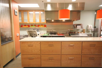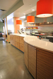 This bright commercial space integrates wood, concrete, stainless steel, and pops of color to create a lively cafe featuring fresh, healthy food.