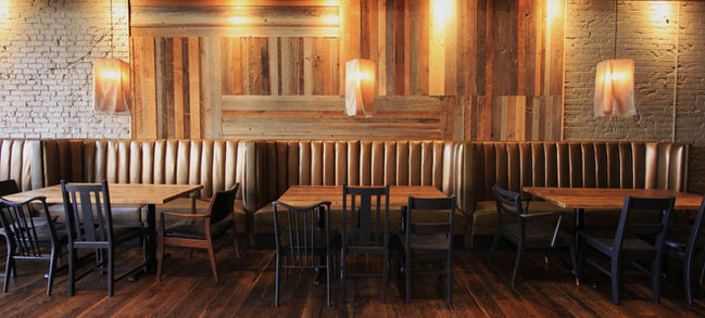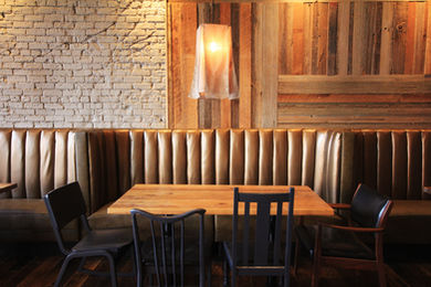 A moody, rustic industrial vibe was created with upcycled barnwood wall panels, custom fabric light fixtures and refurbished antique chairs.